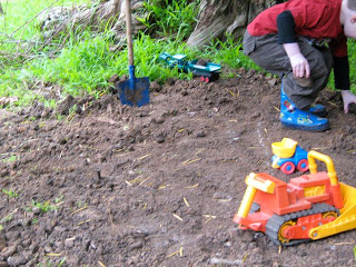 This is the new Mud Pit we built for Little B. It was just part of uneven lawn at the back of our yard that we filled with dirt from another part of the garden. He loves to "dig the foundations" and make roads.